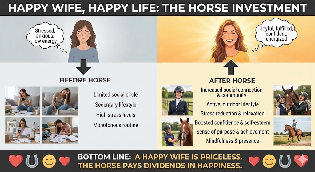 After telling my wife about Gemini 3 Pro and how amazing it was, she asked if she could try it. She played with it for 30 seconds and told me she loved it. Here is her first (and only) prompt with it: Simple infographic to demonstrate how buying a horse would make your wife very happy, so it’s worth it.