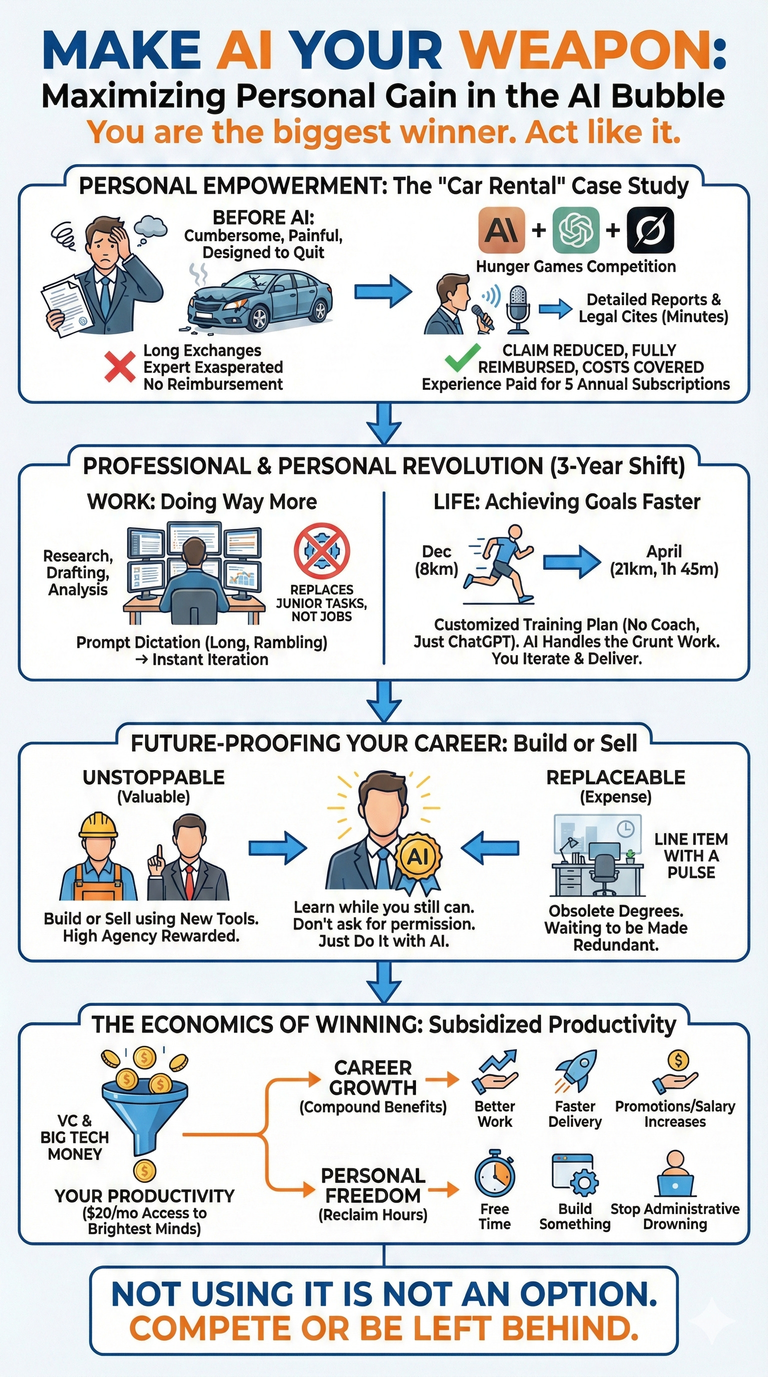 Even if you have a job where doing more does not mean earning more, you can still use AI to your benefit. Outshine your colleagues. Deliver better work. Do it in less time. Same output, fewer hours. Or more output, same hours. Your choice.