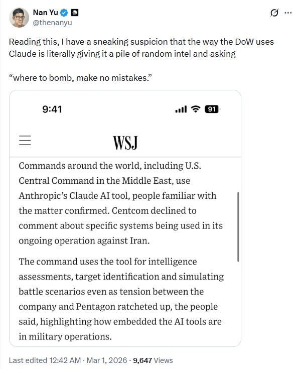 Claude was the first AI model deployed on the military’s classified networks. It was used in the operation to capture Venezuela’s Nicolás Maduro and in the military operations in Iran. The Department of War (yes, they rebranded the Department of Defense) loved Claude’s capabilities.