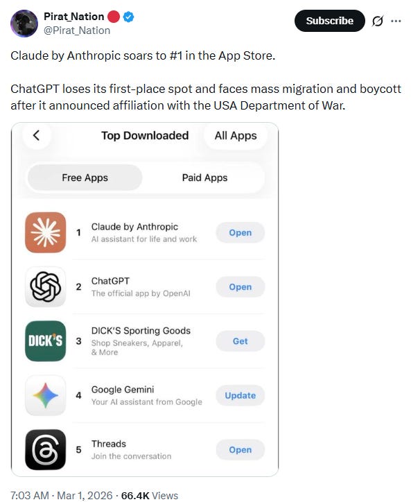 Anthropic’s app rocketed to the number one spot on the Apple App Store, overtaking ChatGPT. Daily sign-ups exploded. Paying subscribers more than doubled year-to-date.
