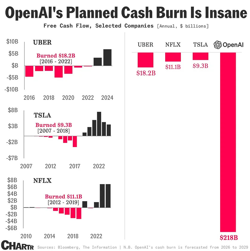 OpenAI alone is projected to burn through $218 billion before becoming profitable. For context, Uber burned $18.2 billion over six years. Tesla burned $9.3 billion over eleven years. Netflix burned $11.1 billion over seven years. OpenAI’s projected burn dwarfs all three combined by a factor of five.