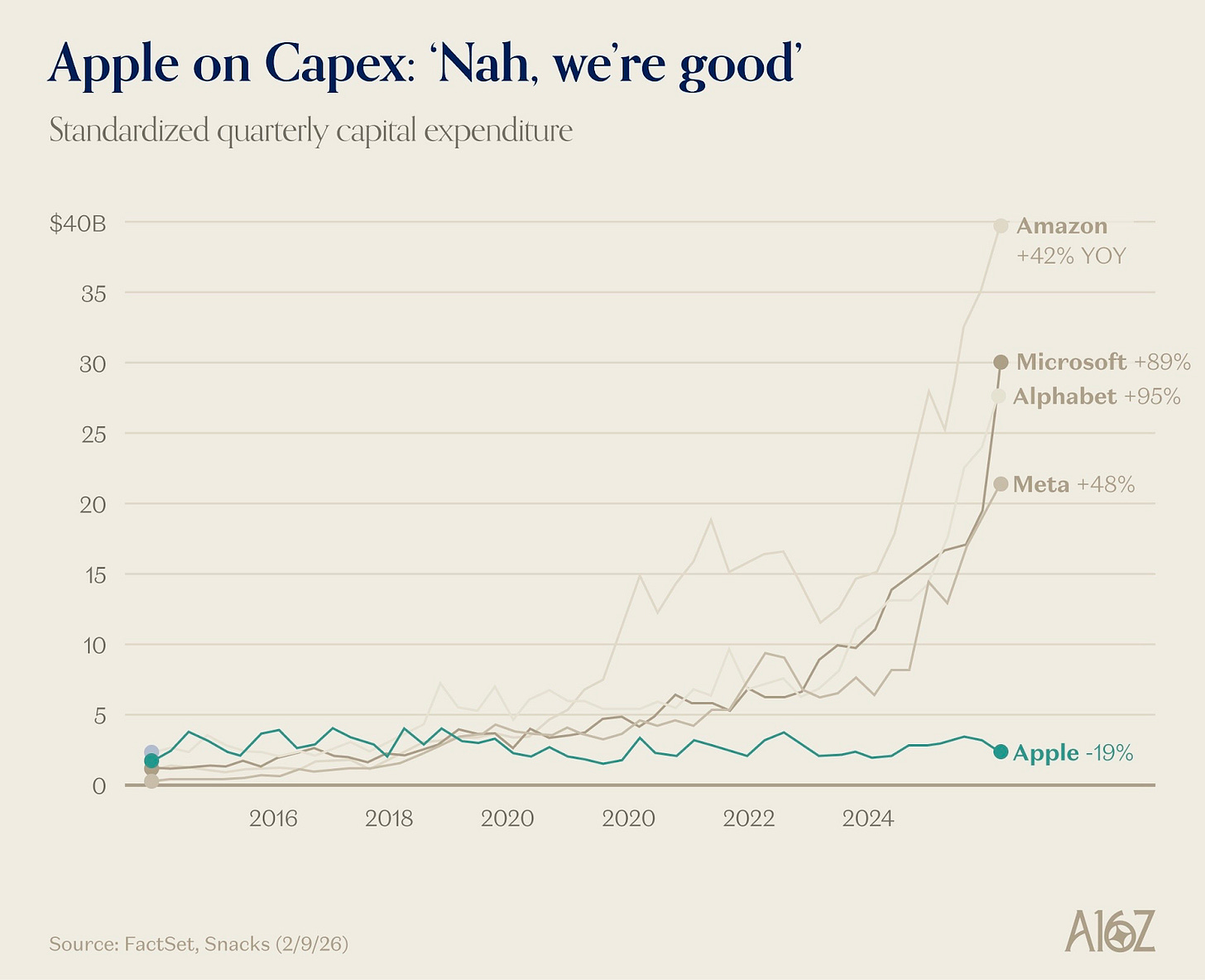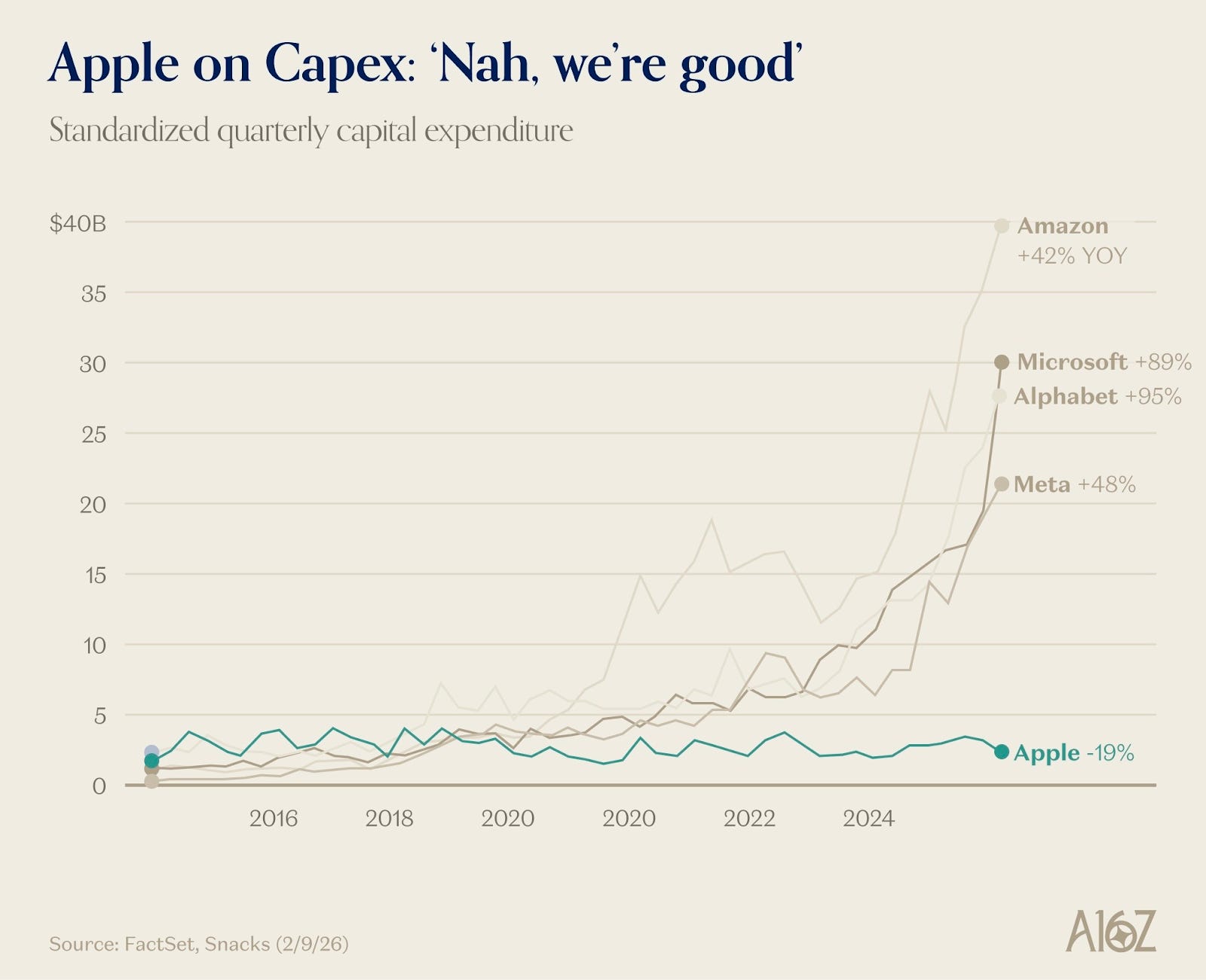 One notable absentee from the AI capex arms race: Apple. While its peers plan to spend $600 billion combined in 2026, Apple’s capital expenditure for the year is a modest $14 billion.