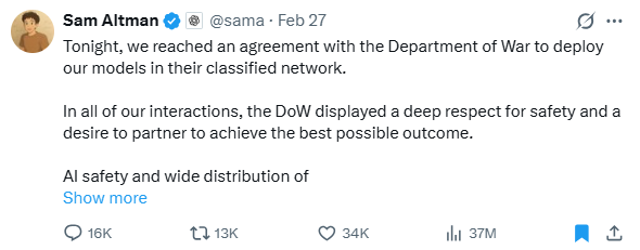 The next day, OpenAI’s Sam Altman stepped in and announced a deal with the Pentagon.